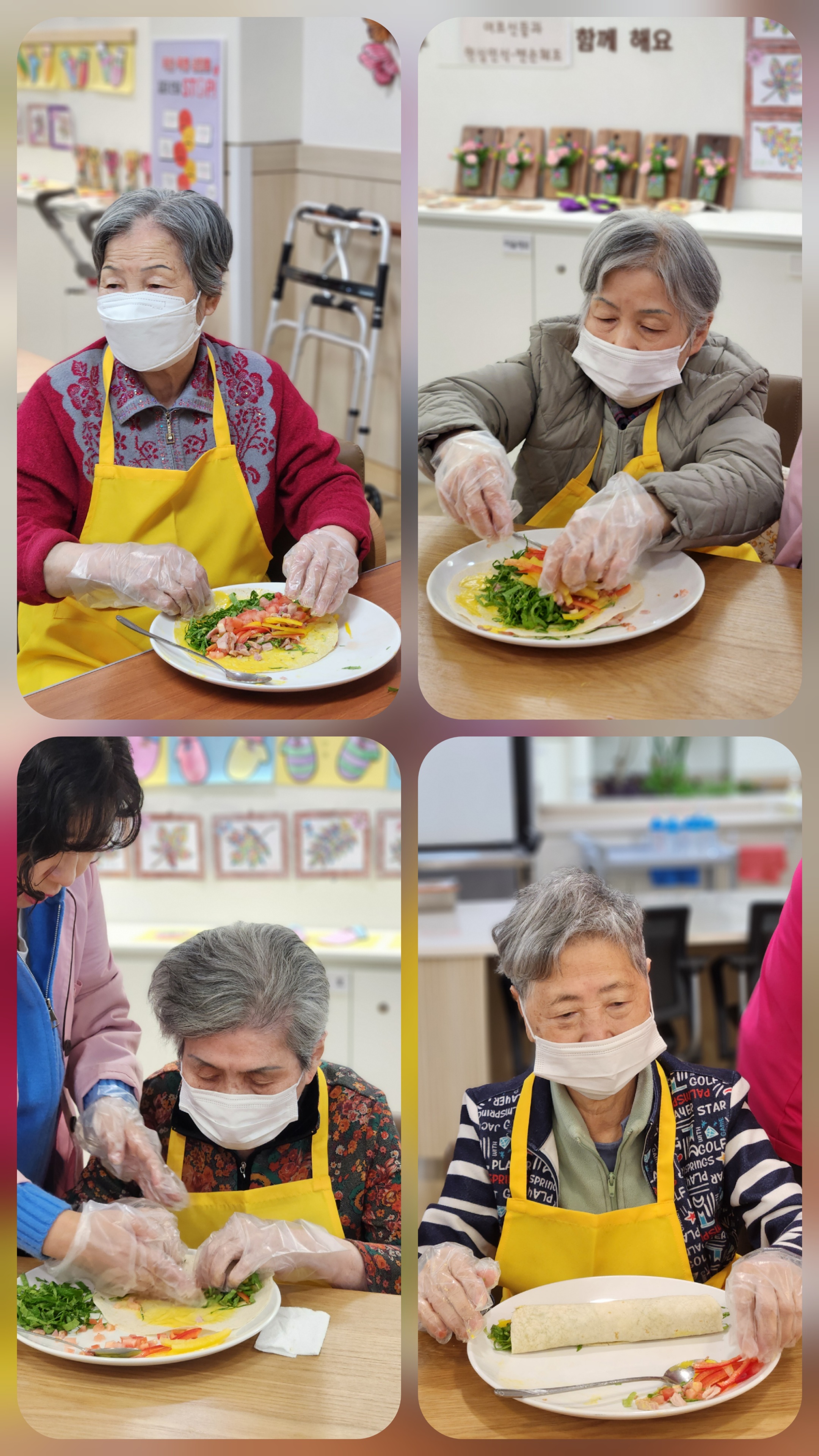 오늘은 쉐프를 초청하여 어르신들과 함께 멕시코 음식인 또띠아롤을 만들었습니다.